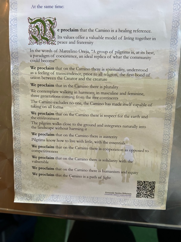 this lovely proclamation was at the second food truck and we found it to be so profound. If you can zoom in and read the words, it clearly spells out what the Camino means to so many of us that are out here.