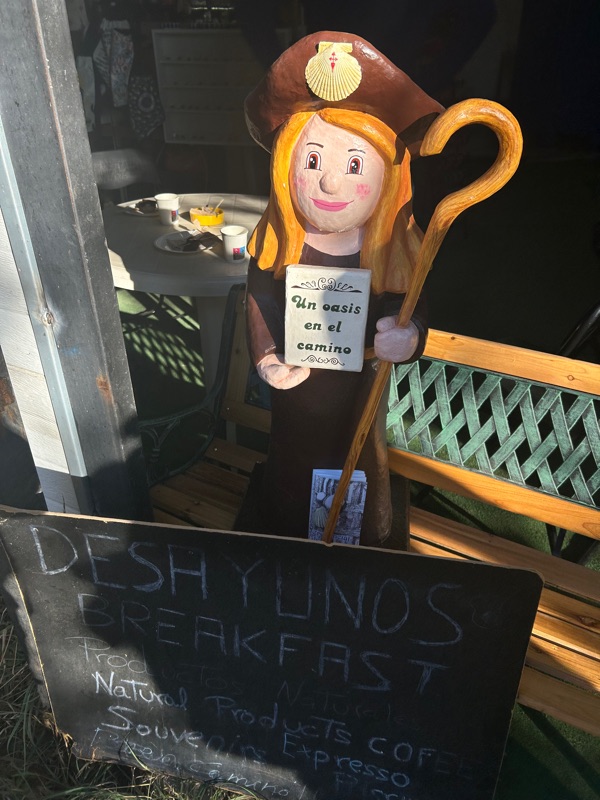 I can’t believe that 2 weeks from today we will walk into Santiago de Compestella! We took our time this morning to get started as it was a short day for us. It was still only about 40 degrees when we started and we were so grateful that we found gloves last night.🥶 side note: this little market where we found the gloves…reminded me of the Diagonal alley in the Harry Potter books , it was dark and he kept going in the back to get a box with what we asked for lol! This is also where we bought the Spanish cards!