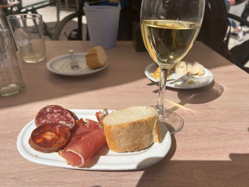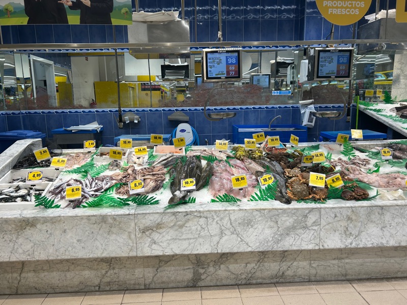 We stopped for a glass of wine and were treated to these tapas, the other picture is the fresh fish counter at the local supermacado where we shopped for our dinner we hosting tonight.