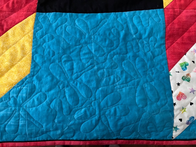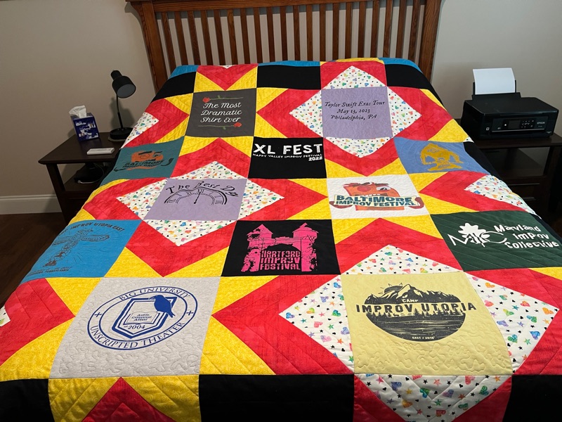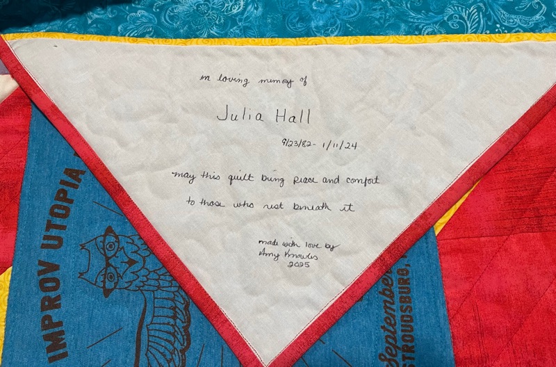 The beautiful quilt Amy made for me using several of Julia’s tshirts.